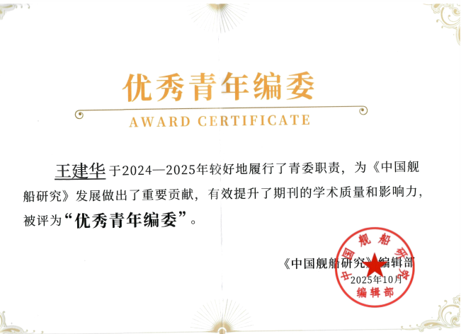 上海交大CMHL研究中心王建华副研究员荣获优秀青年编委奖。编委会副主任冯浩副所长代表编辑部致欢迎词,常务副主编易基圣作了“锚定一流,创新突破,促进期刊高质量发展”的工作总结。《中国舰船研究》作为中国核心科技期刊的影响因子持续提升,在船舶核心期刊中继续位居第一。同时,首次进入CSCD 数据库核心库。获评“中国应用型权威期刊”(装备制造大类前5%),并蝉联中国航海学会高质量科技期刊目录T1级,彰显了其在舰船领域的学术领先地位。
