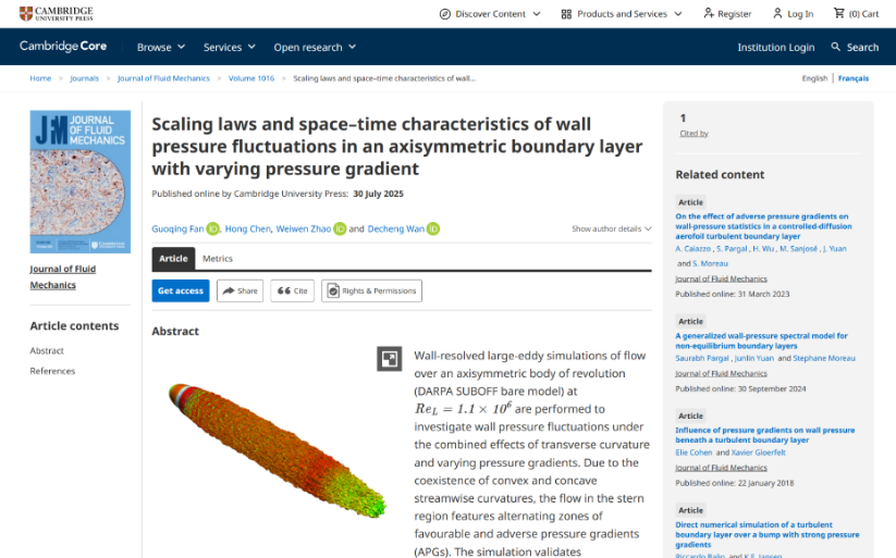 2025年,博士生范国庆在导师万德成教授的悉心指导下,在青年老师赵伟文副研究员的帮助下,在国际著名流体力学杂志《Journal of Fluid Mechanics》上发表了题为“Scaling laws and space-time characteristics of wall pressure fluctuations in an axisymmetric boundary layer with varying pressure gradient”的论文。该成果表明CMHL研究中心在万德成教授领导下,近年来在高雷诺数湍流、复杂曲面边界层建模、流动噪声源机理与数值预报方法研究等方面取得的新的创新研究成果,得到了国际同行专家和学者的高度认可。
